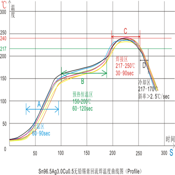 該(gāi)區域的意圖(tú)是把室溫的PCB趕快加熱,以抵達(dá)第(dì)二個特(tè)定政策,但升溫速率(lǜ)要控(kòng)製在恰當規劃以內,假定過快,會發(fā)生熱衝擊,電路板和元件都容易受損;過慢,則溶劑蒸發不充(chōng)沛,影響焊接質量。由於加熱速度較快(kuài),在溫區的後段SMA內的溫差較大。為防止(zhǐ)熱衝擊(jī)對元件的危害,一般速度為4℃/s。可是,一般上升速率設定為(wéi)1-3℃/s。典型的升溫速(sù)率(lǜ)為(wéi)2℃/s。